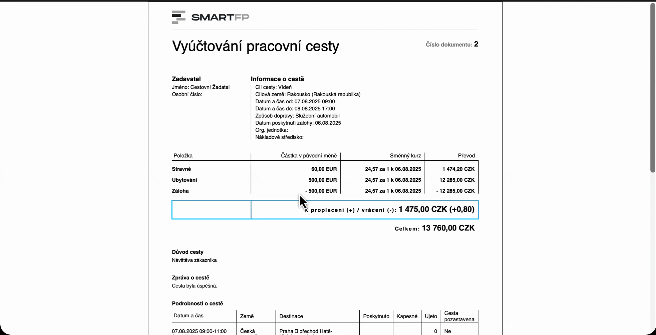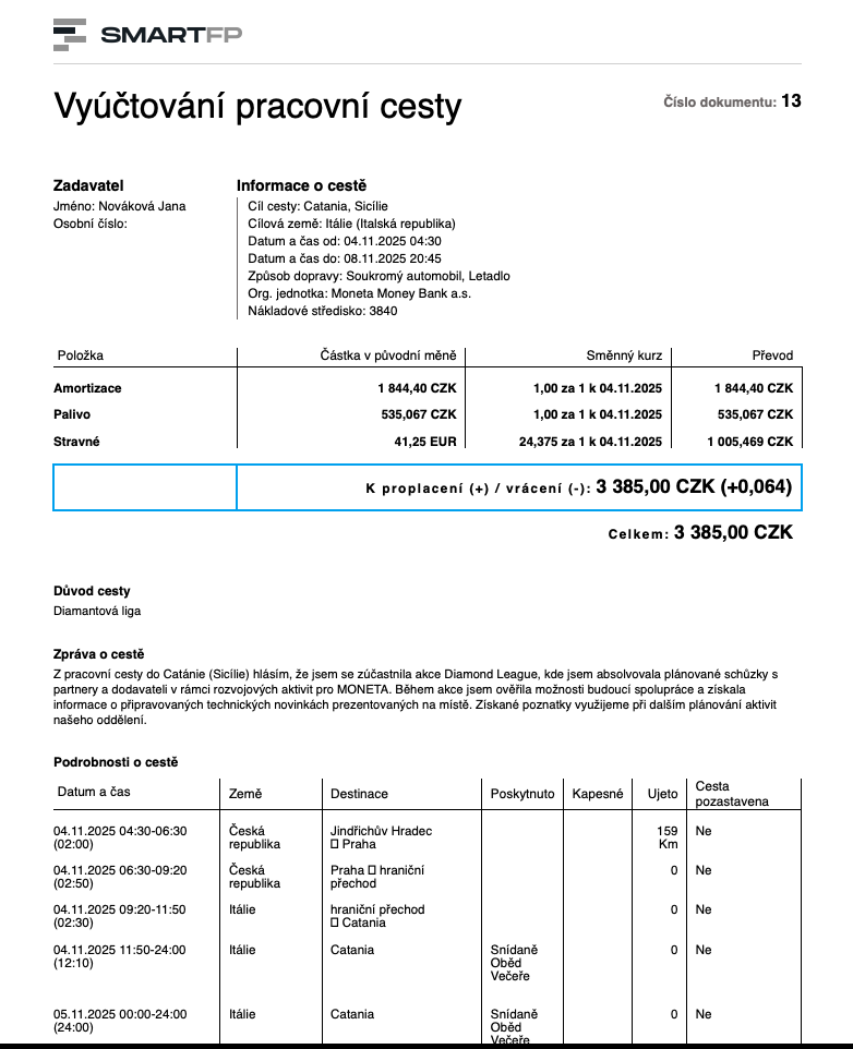 • PDF přehled cesty včetně výpočtu náhrad (stravné, cestovní náhrady apod.)