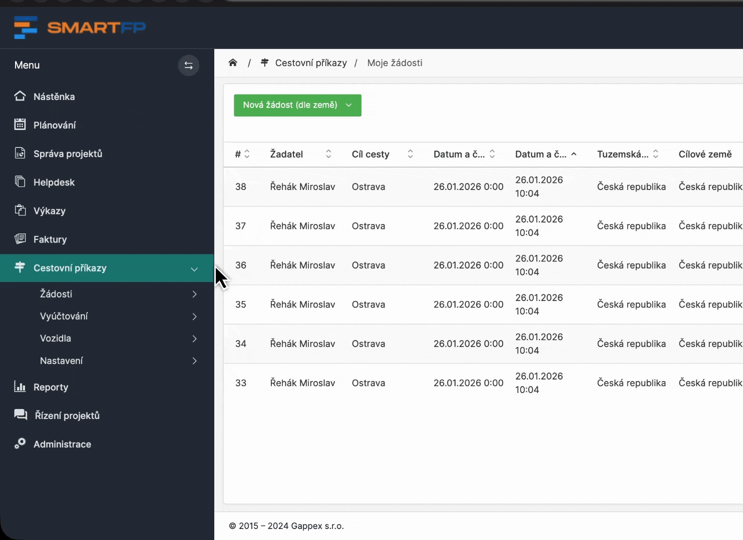 Cestovní příkazy SmartFP propojují žádost o pracovní cestu a vyúčtování pracovní cesty do jednoho navazujícího procesu (žádost může být povinná, nebo ji lze vypnout).